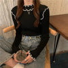 パイピングのメロー加工がポイントのニットボディラインにフィットするリブ編みでフェミニンなデザインです。定番の黒と明るめのカラーバリエーションでロングシーズン活躍します。